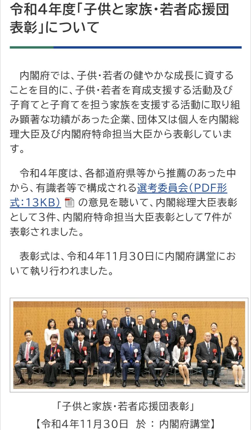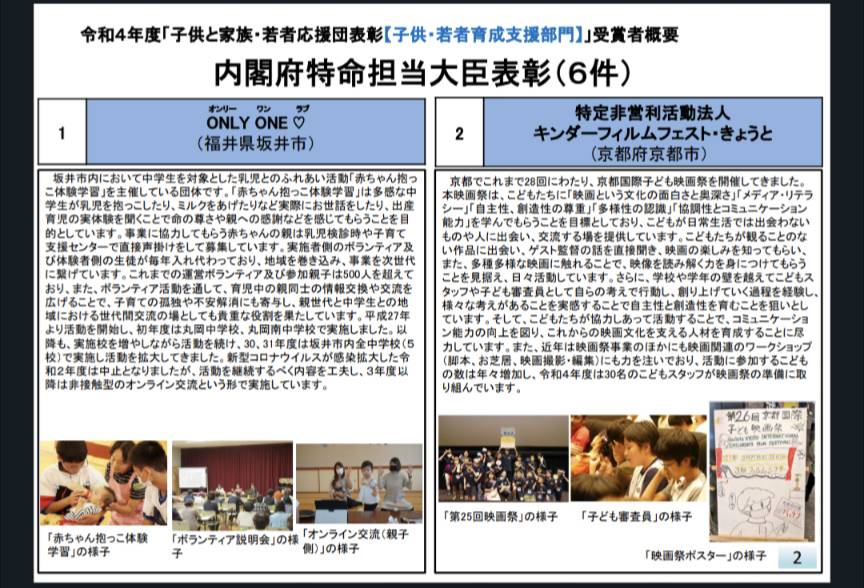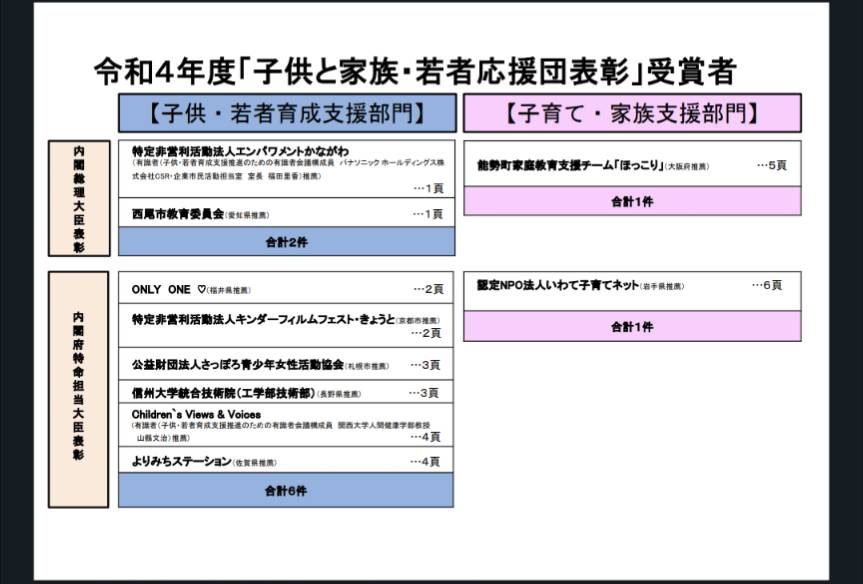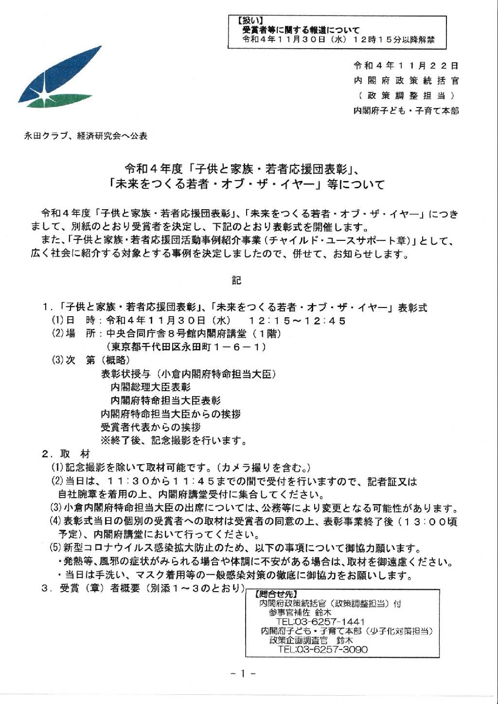 令和4年度 「子供と家族・若者応援団表彰」「未来をつくる若者・オブ・ザ・イヤー」